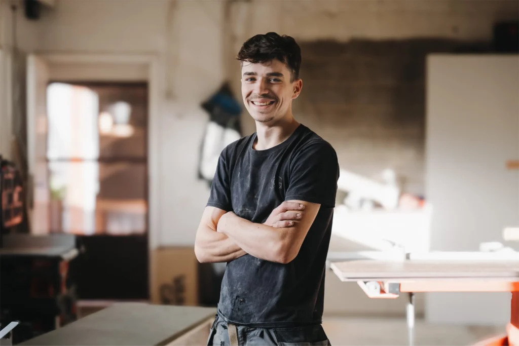 Mijn naam is Brent Goos — jonge ondernemer en zelfstandig schrijnwerker in bijberoep uit Laakdal. Ondernemen zit in mijn familie: mijn opa was een gepassioneerde zelfstandige bakker en mijn mama en nonkels runden jarenlang Garage Macquoi. Die ondernemerszin en liefde voor ambacht heb ik meegekregen, en die vormen vandaag de basis van mijn werk als schrijnwerker.