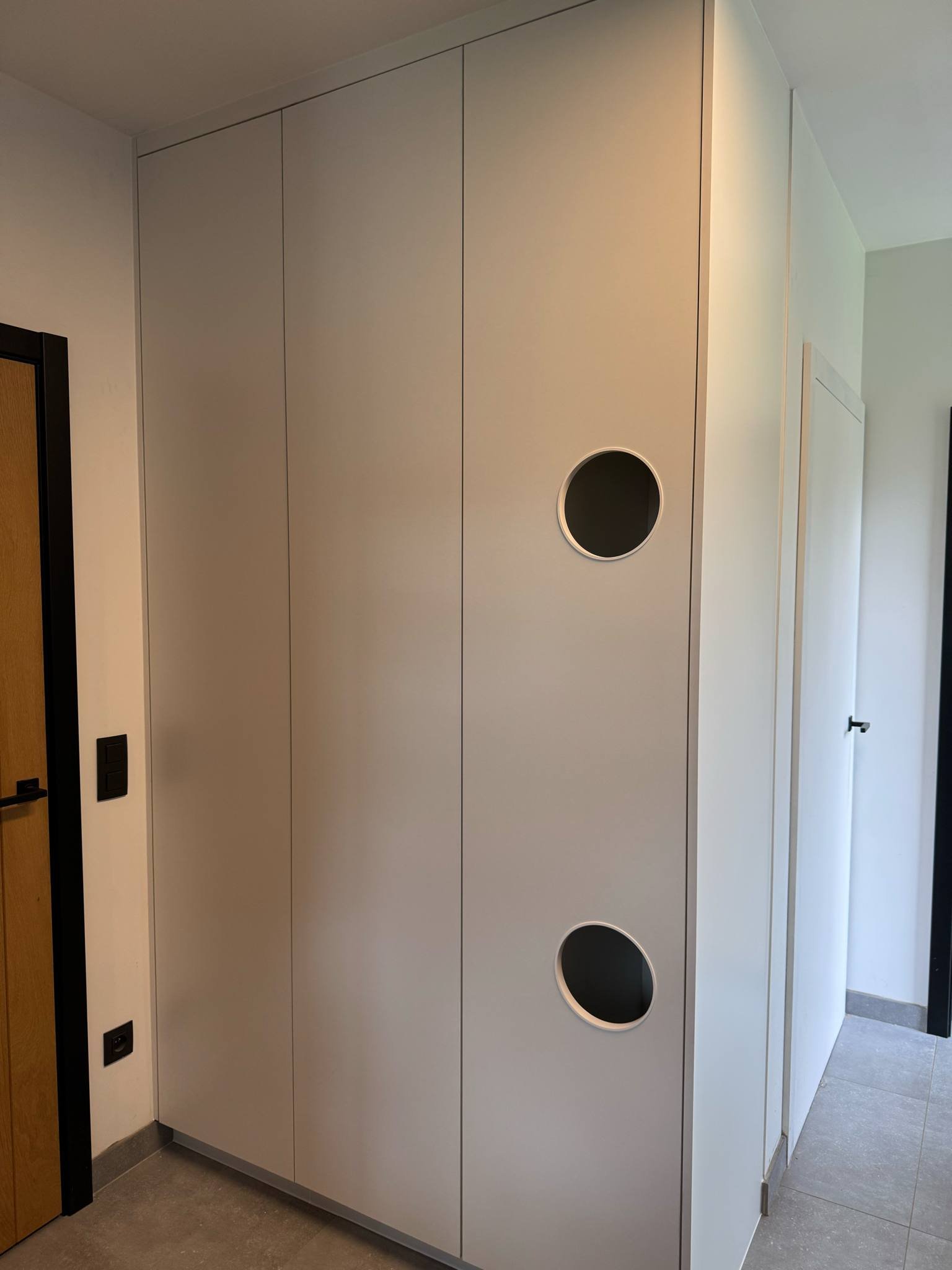Op de foto's is een indrukwekkende, wandvullende kastencombinatie te zien die fungeert als zowel opbergoplossing als esthetisch element. De afwerking is uitgevoerd in een warme houtstructuur gecombineerd met strakke, witte fronten, wat zorgt voor een rustig maar luxueus contrast.